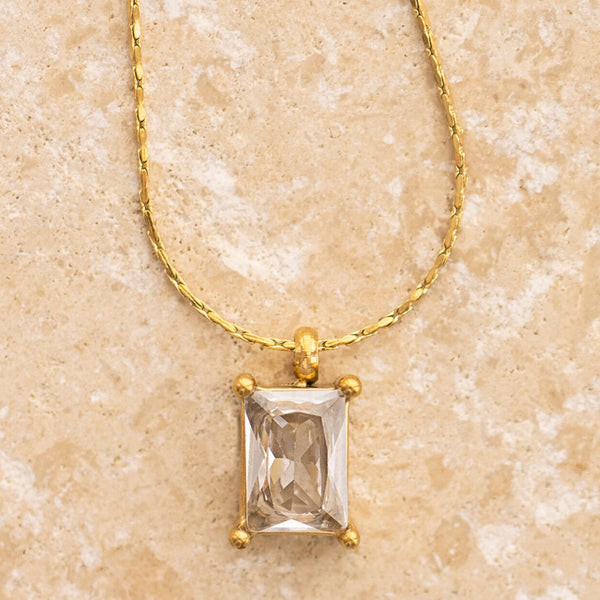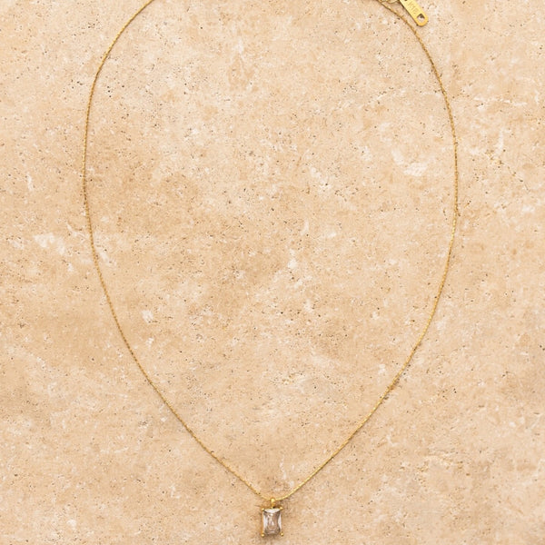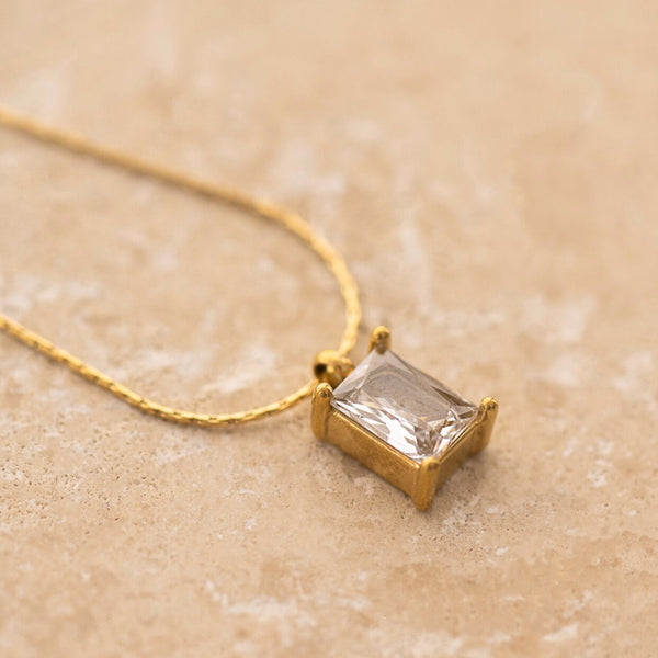 A delicate clear gemstone on a fine gold chain.
