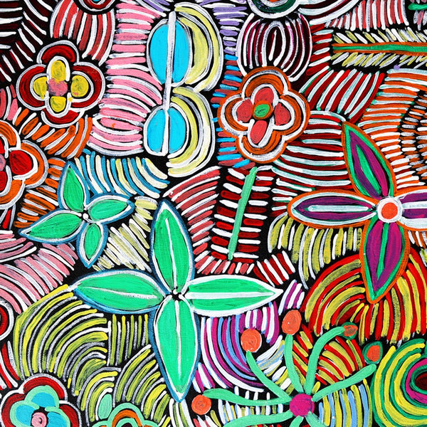Josie Kunoth Petyarre (Josie Kunoth Mbitjana Pitjara) is an artist from the Utopia homelands, 300km North East of Alice Springs. She describes her art as a “Bush mix up”: the things she sees on her country - Bush Yams, wildflowers, native seeds and leaves. Josie’s unique, optimistic style is captivating and we are honoured to feature art from 3 of her paintings commissioned exclusively for this special Moe Moe collection. Read more about Josie here.