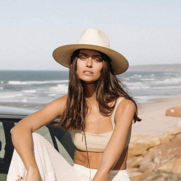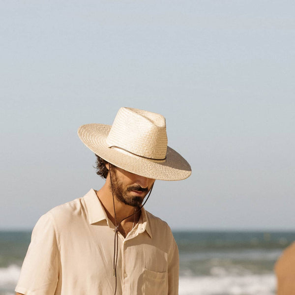 The Rider is a lightweight sun hat made from natural palm straw inspired by long days at the beach.