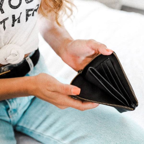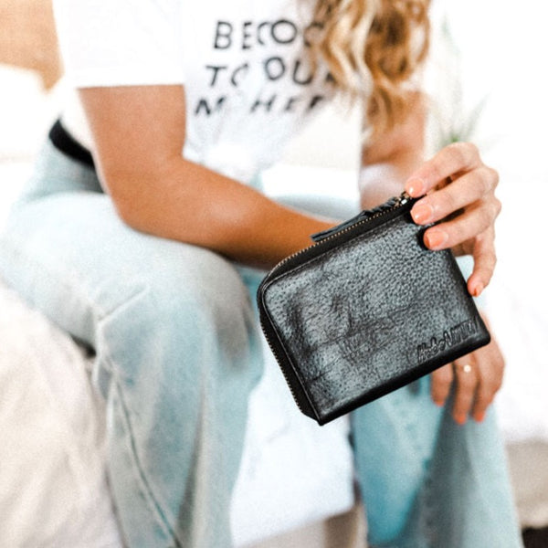 Featuring a braided leather zip. She opens to 3 card slots and an inner pocket.
