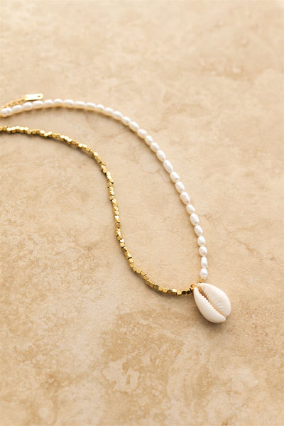 A natural cowrie shell embraced by gold hues and fresh water pearls.