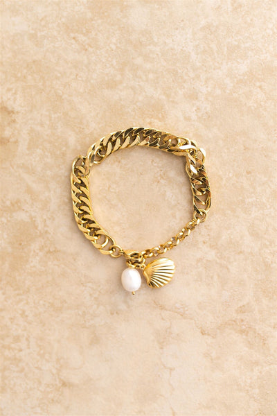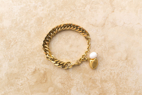 Designed for the lovers of the Sand and Sea.Ocean is a chunky bracelet featuring a stunning shell and pearl charm.