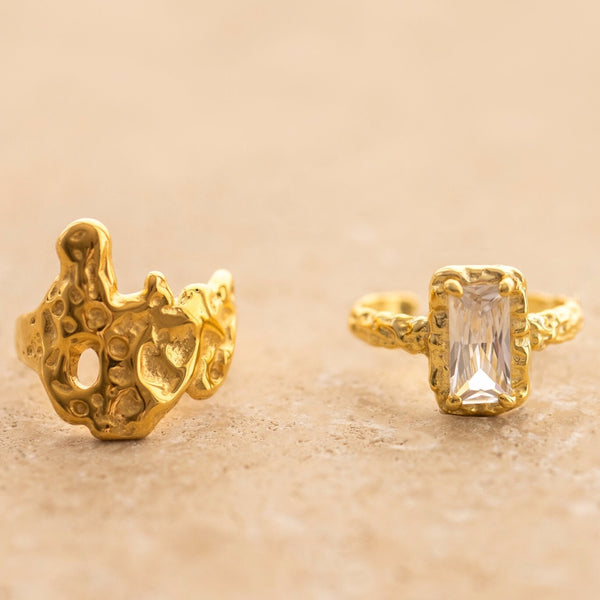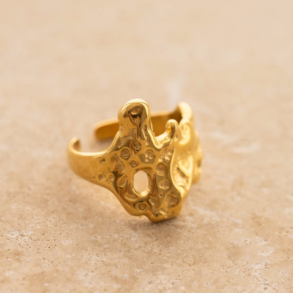 A gorgeous, irregular shaped ring featuring crushed gold hues.
