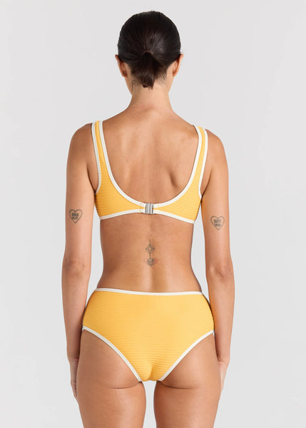 Crafted from a softly textured fabrication and finished with contrast ivory binding, the golden yellow Sunshine hue feels warm, nostalgic, and effortlessly wearable.