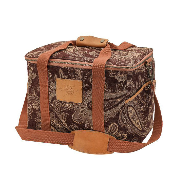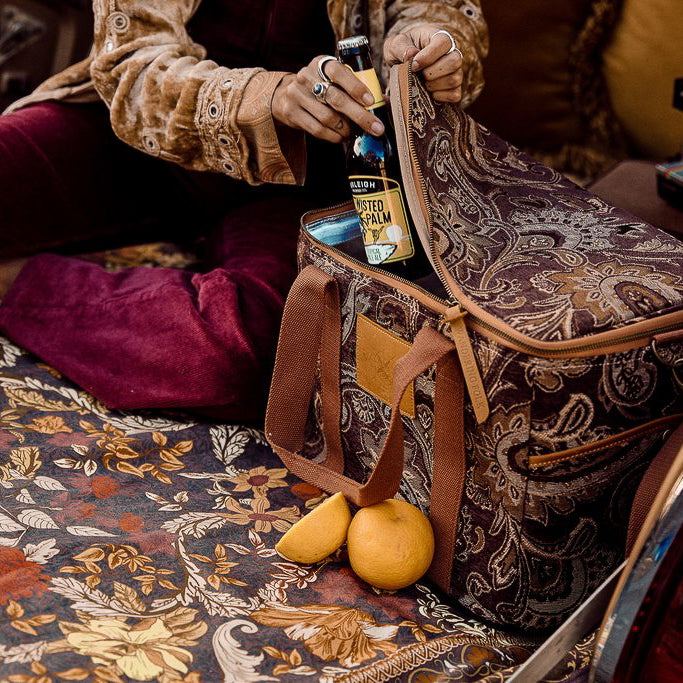 Our trendy cooler bag is perfect for adventures with your Wandering Folk picnic rug. It’ll keep your drinks and snacks well chilled with it's padded cooling insulation and hand straps and removable/adjustable shoulder strap make it easy to carry.  There are 2 x snap pockets on the outside for bottle opener, cheese knives, keys and personal items.  The straps are is made of durable woven cotton webbing, trimmed with a leather handle and shoulder pad for extra comfort.  All seams are sealed and leak proof so no water will soak the cooler bag.  The outer fabric is a woven cotton blend and shouldn't need to be washed as the clear interior lining velcros out for easy washing.  The base is made from the same waterproof canvas our rugs- heavy duty and tough, with brass metal feet for extra protection.  Logo patch, pocket binding and logo zip pulls are also leather.