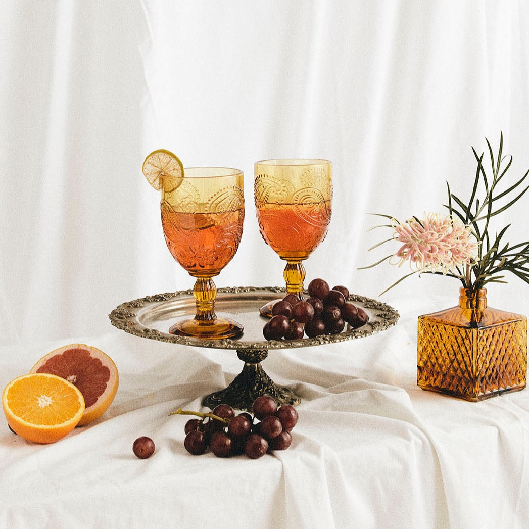 Set of 2 x Goblets in Amber glass. This stunning set makes a bold picnic statement with its embossed paisley design.