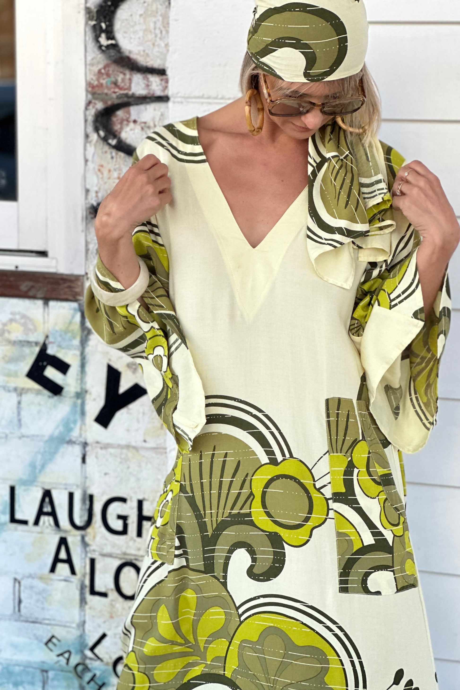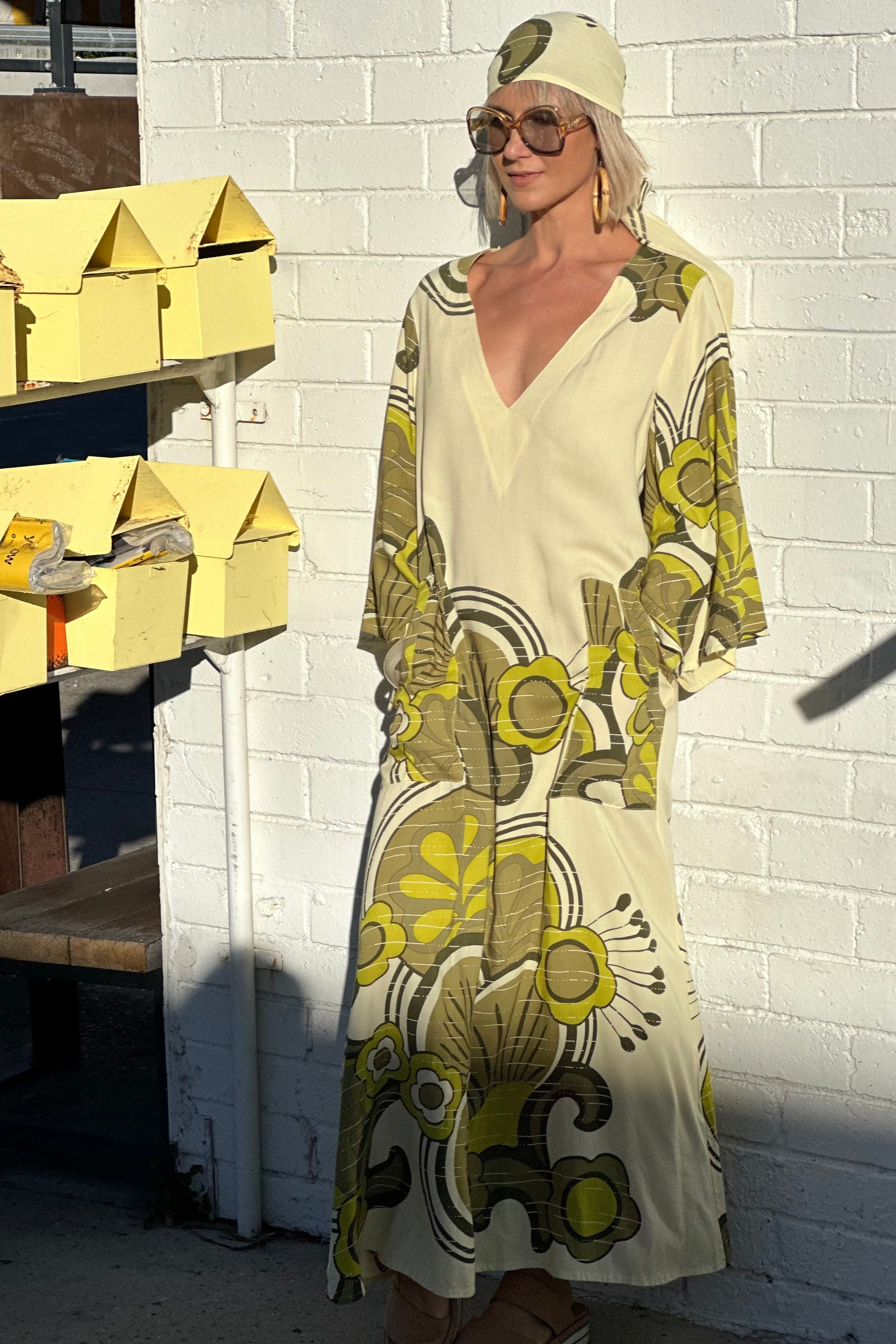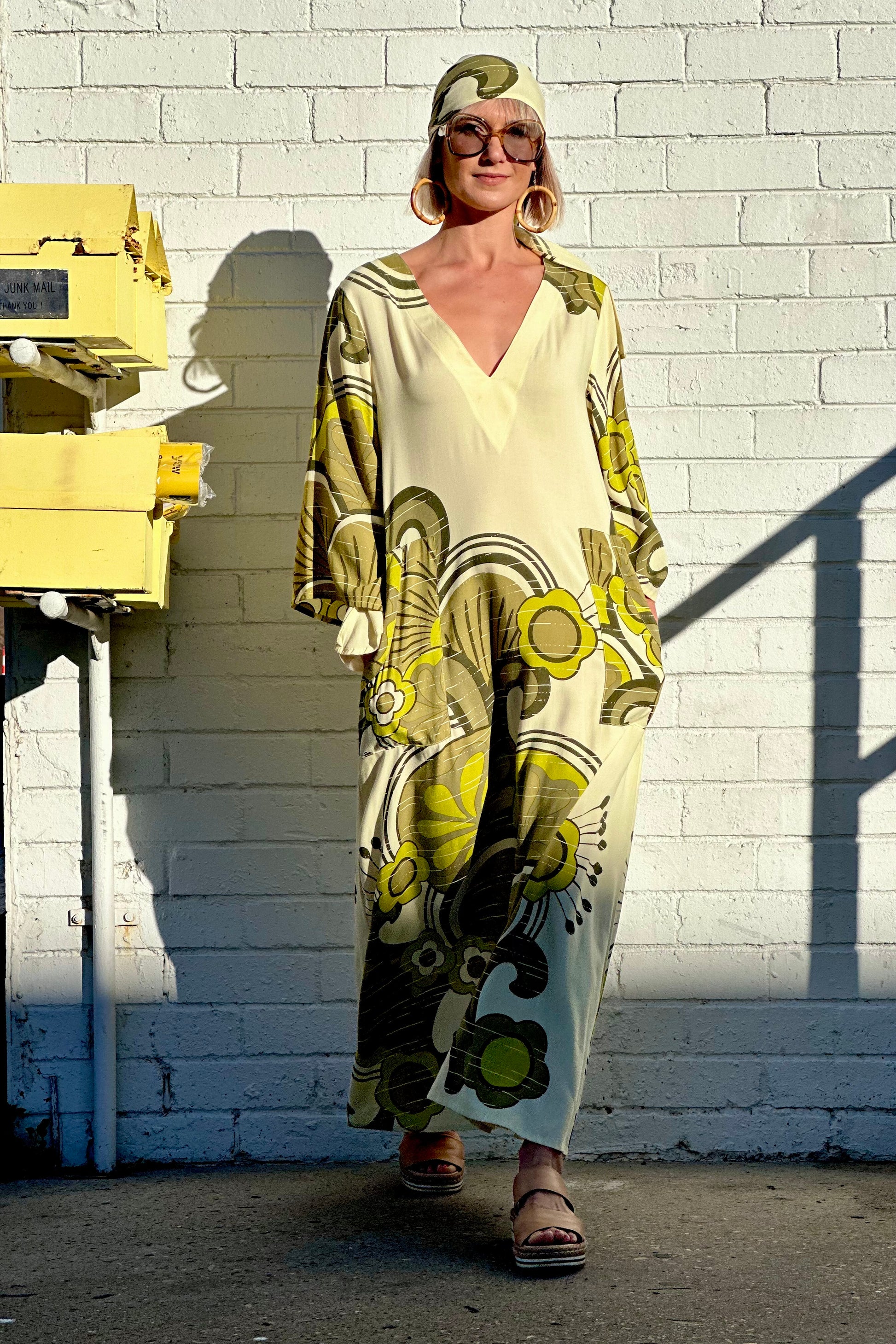 This flowy 70’s inspired kaftan, with bell sleeves and front pockets drapes effortlessly over your body.