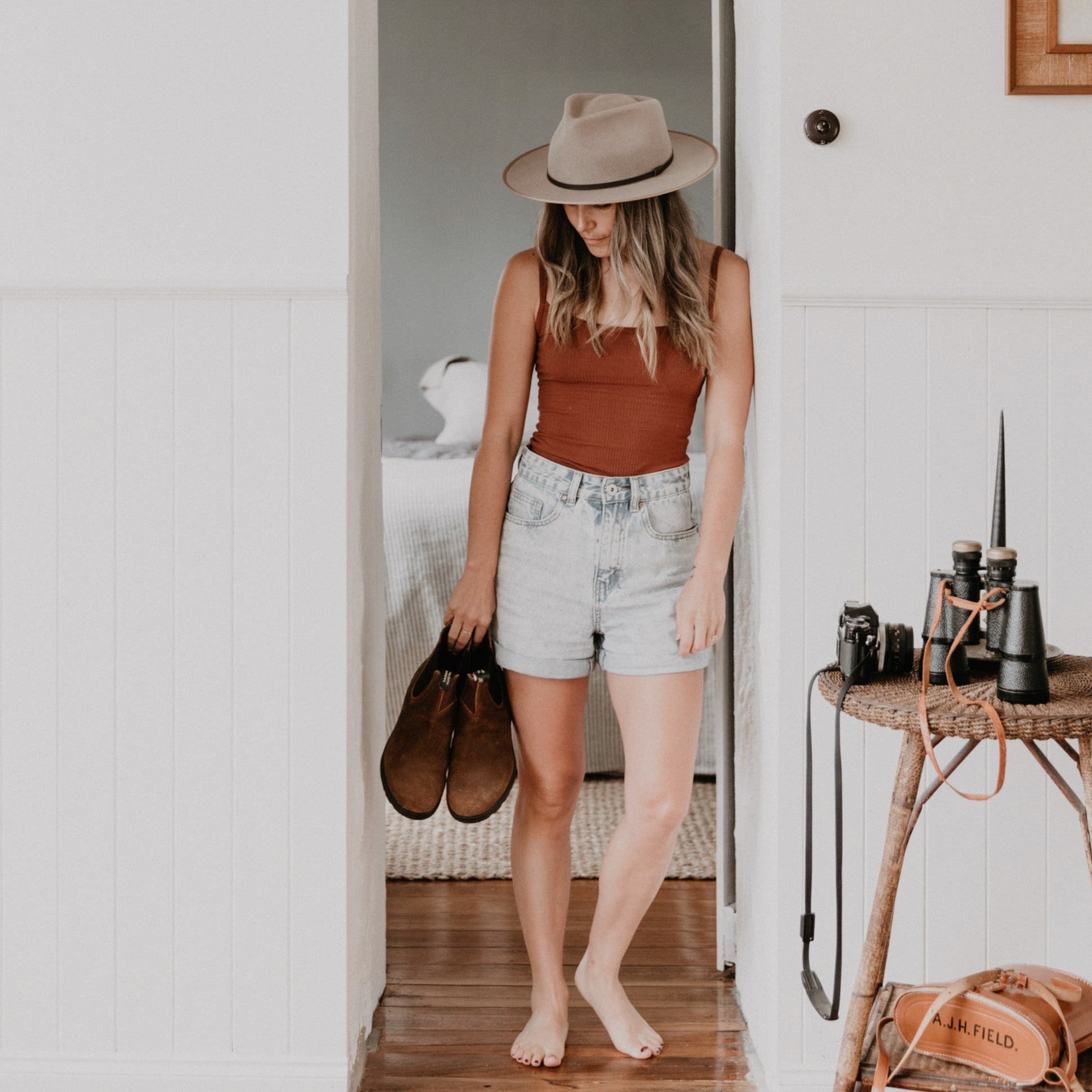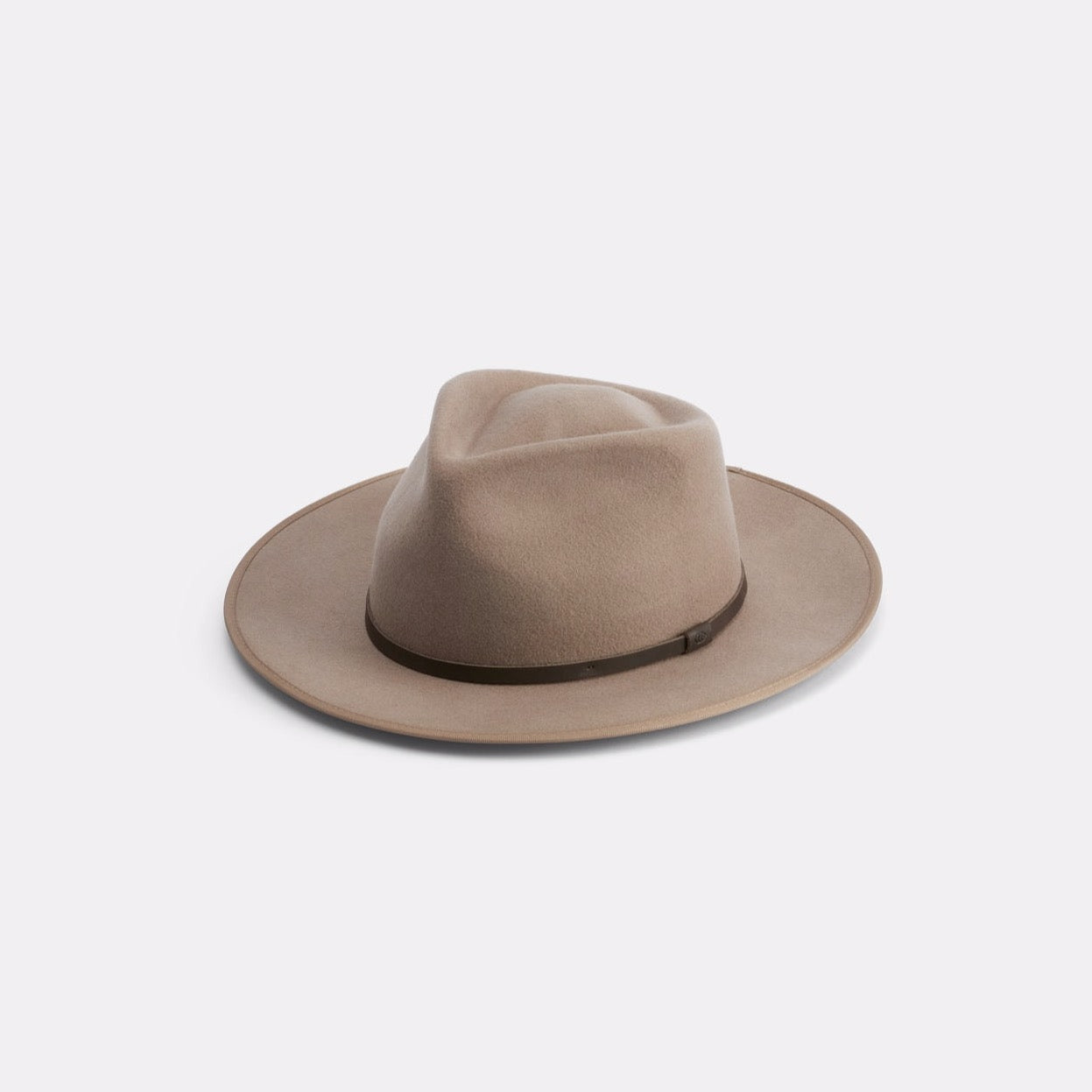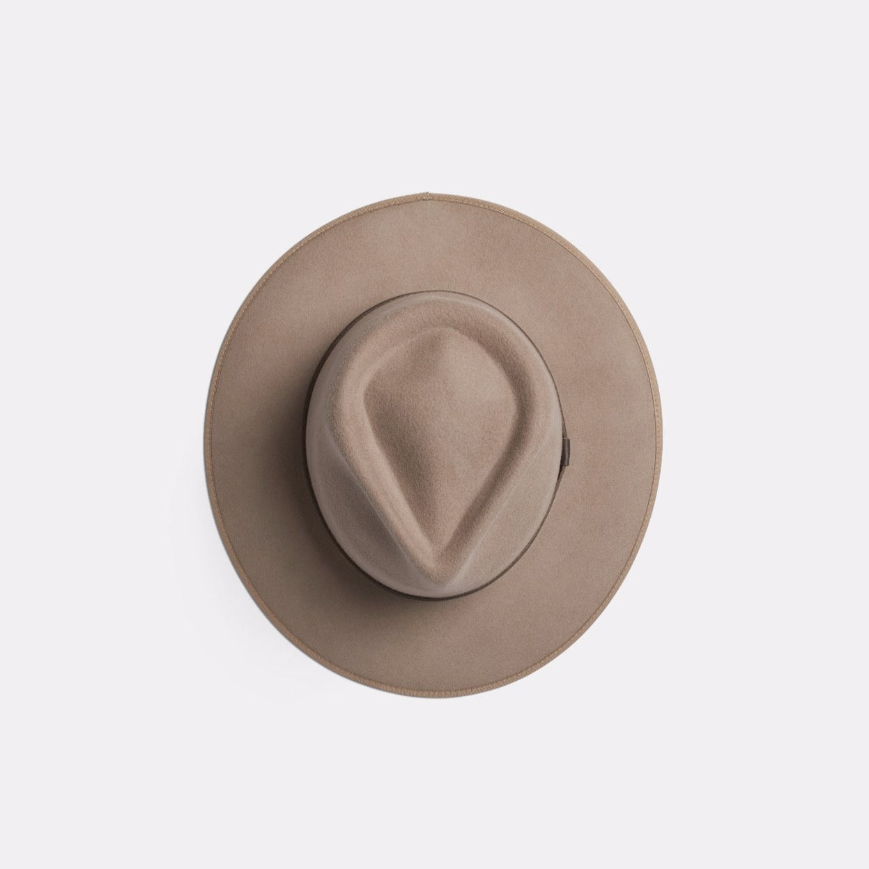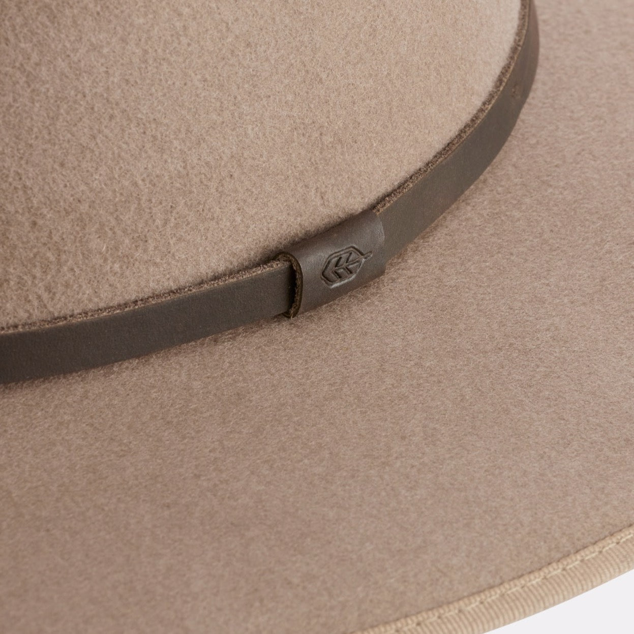 The Calloway is our best selling style and is crafted from 100% Australian wool, and trimmed with our signature premium matte leather band. It has a stiffened 7cm wide brim, finished with a grosgrain bound edge to help it last the extra mile. A crisp teardrop pinched crown provides a distinctive silhouette. Timeless and approachable, the wide brim light brown fawn fedora is perfectly suited to any adventure.
