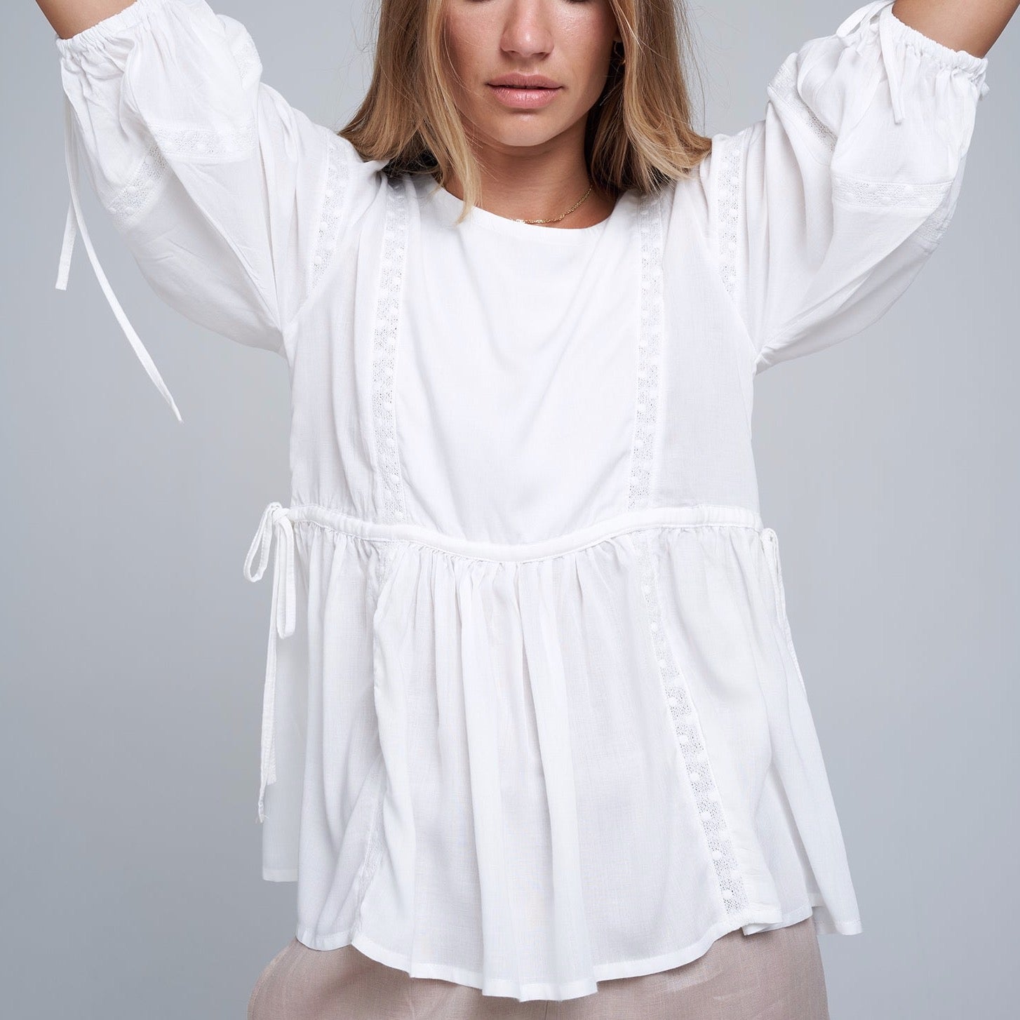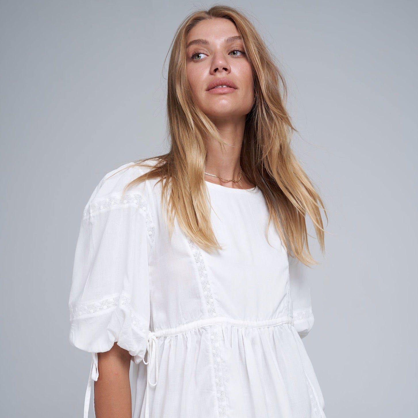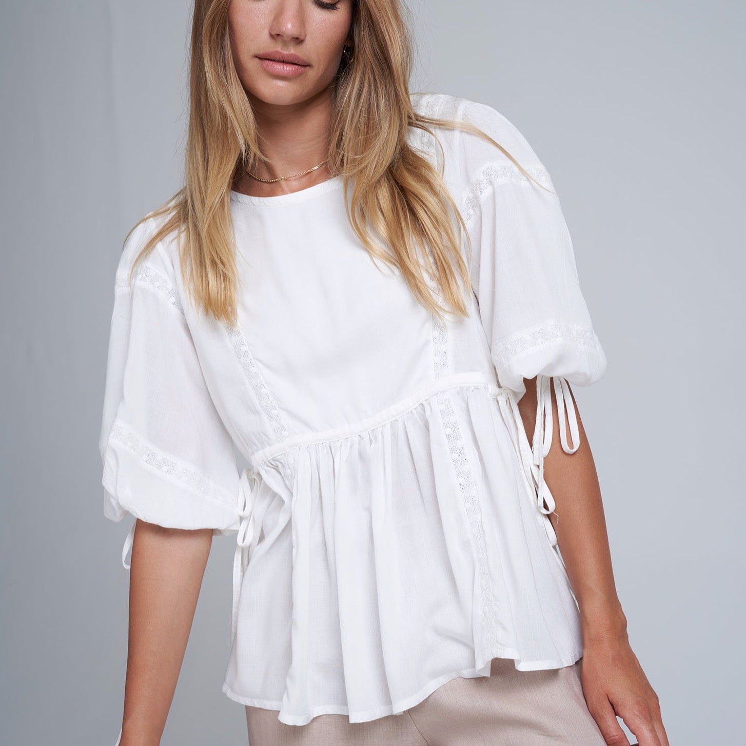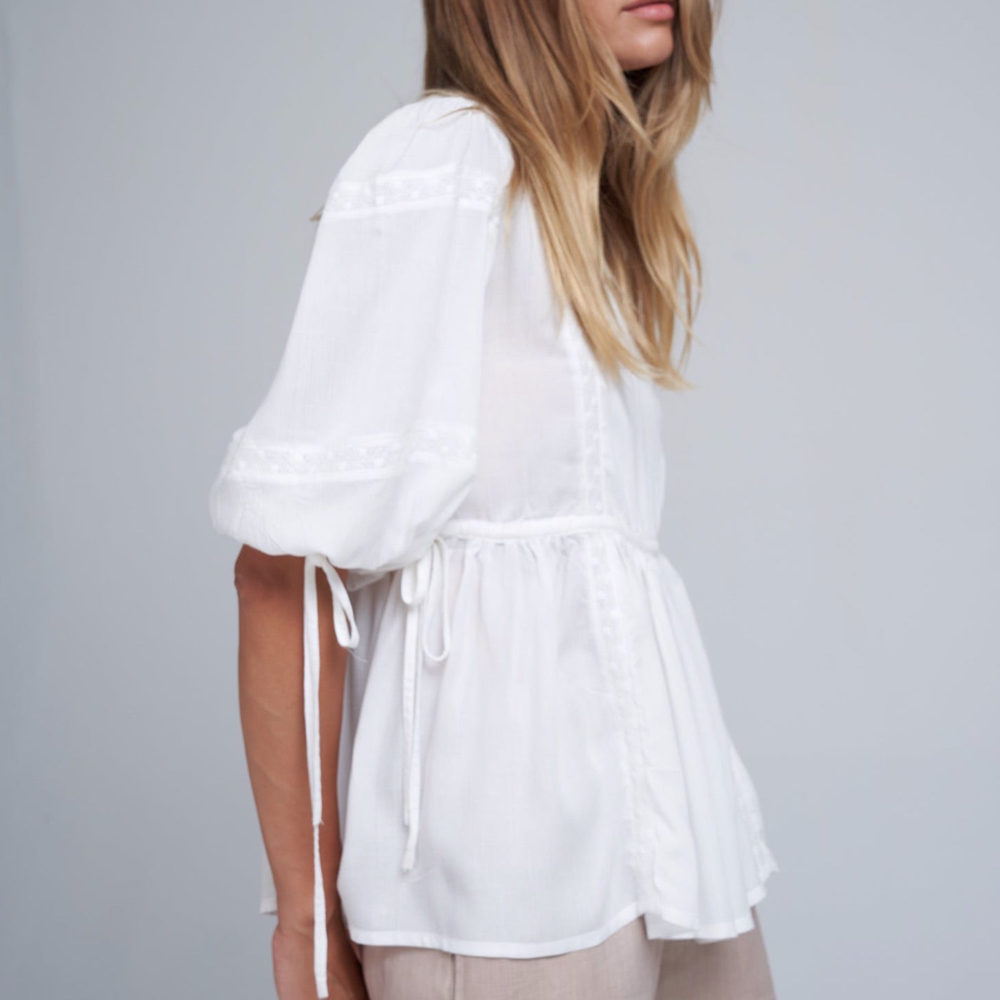 Channelling feminine elegance, the Sana Top will take you from day to night in any season. This white top by LILYA is crafted in a soft rayon voile and features a classic neckline that ties at the back, elegant cotton lace detail, elbow length elastic balloon sleeves and the drawstring waist can be tied to enhance your silhouette or wear loose for comfort. It has a low V cut out back.
