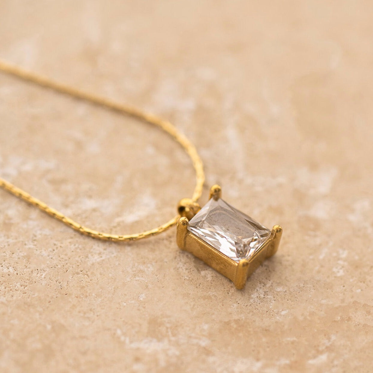 A delicate clear gemstone on a fine gold chain.