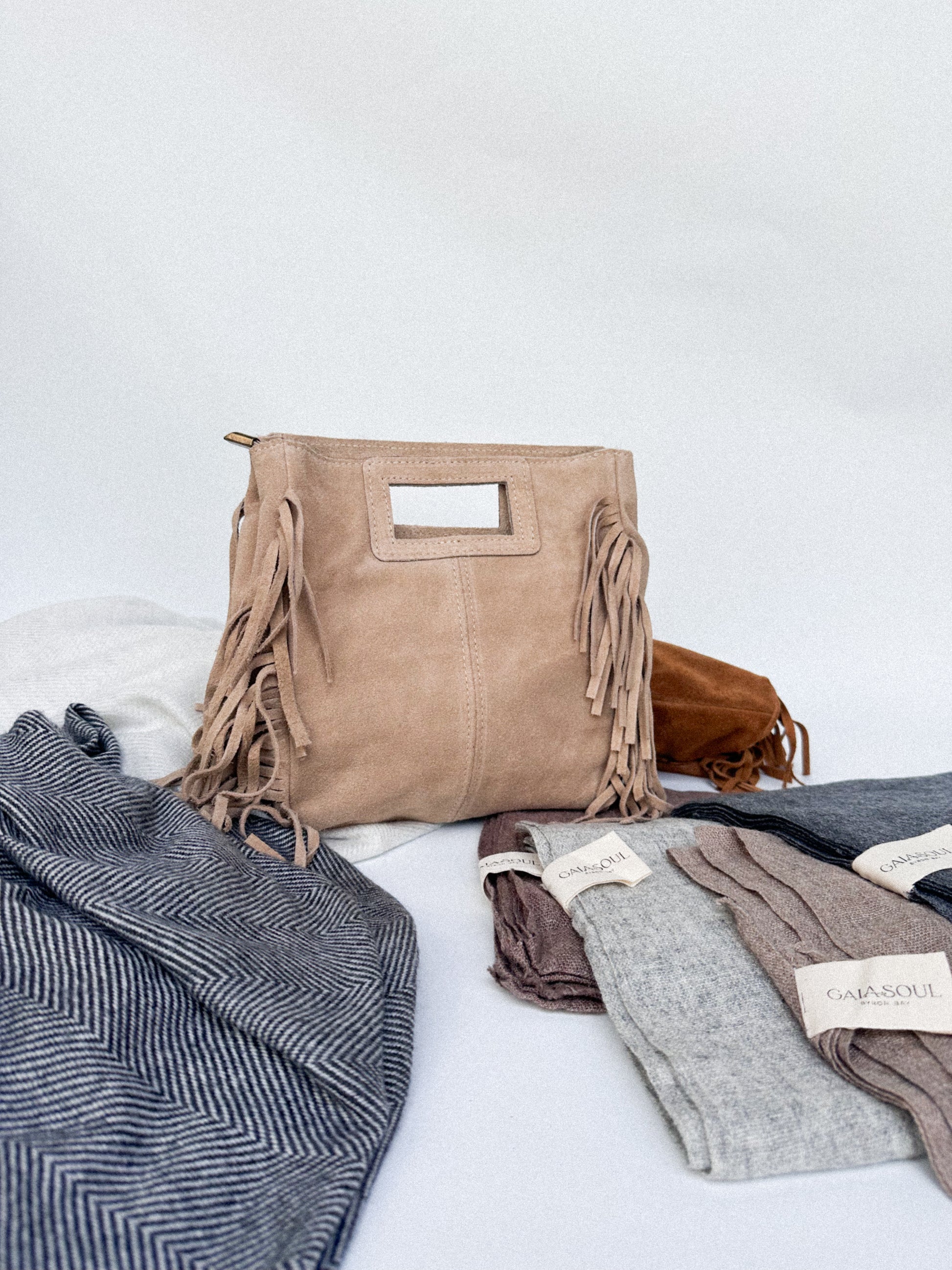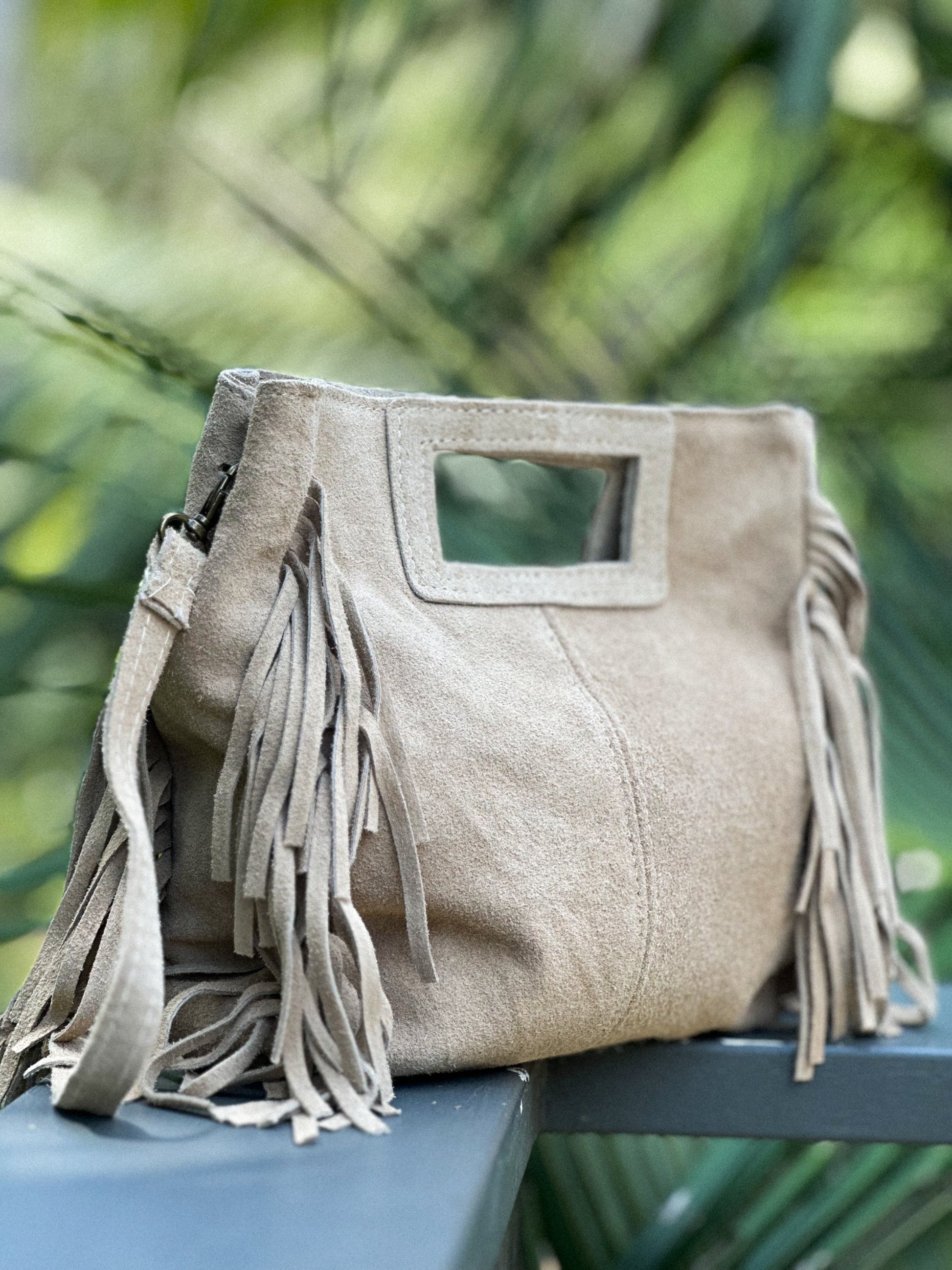 Nuka Handbag – Suede Fringe Crossbody Bag / Beige Leather