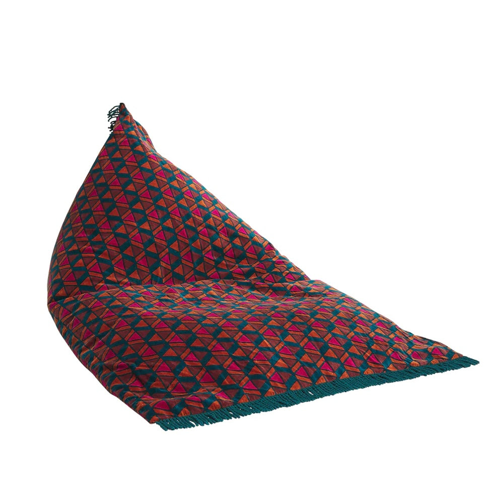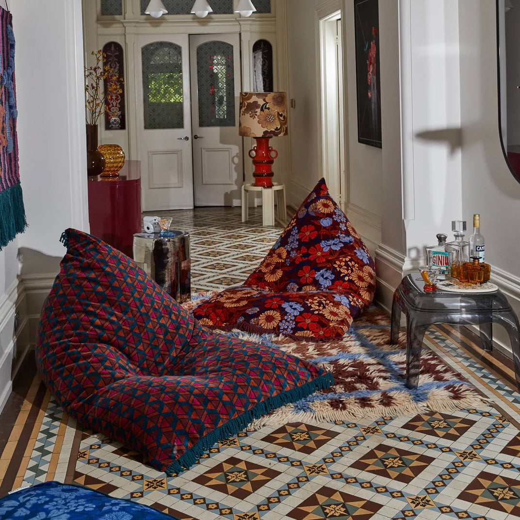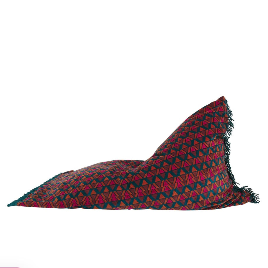 “Our signature bean bag gets a retro-inspired update in this geometric print. Created to look like a vintage velvet sofa at Nonna’s house that you just want to snuggle into. Textural fringe trim adds an extra touch of fun to this relaxation-ready essential.” – Phoebe’s Style Notes