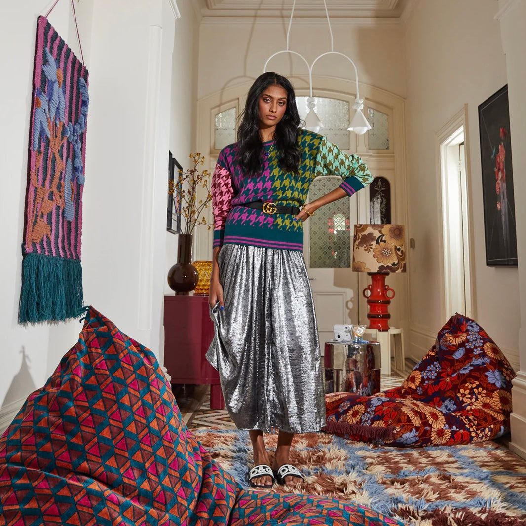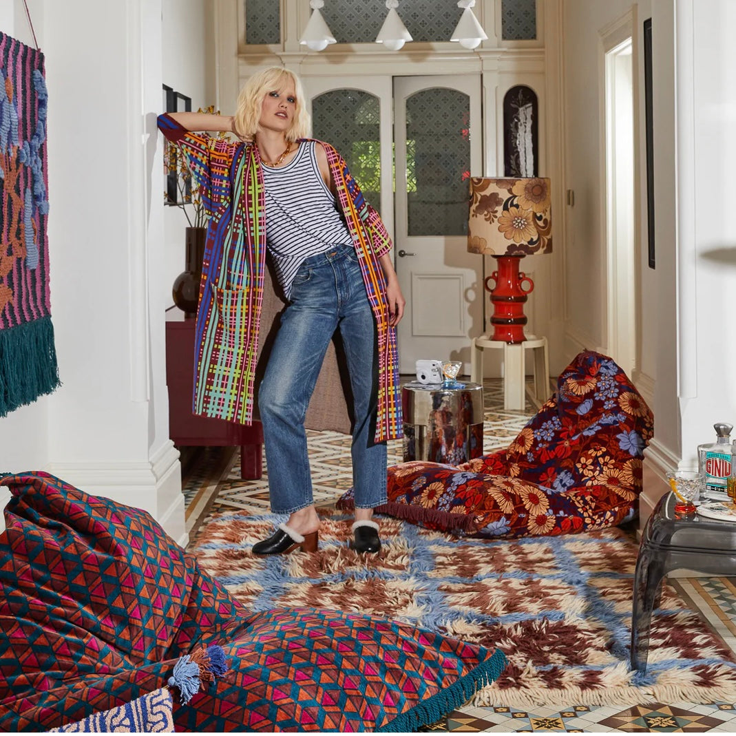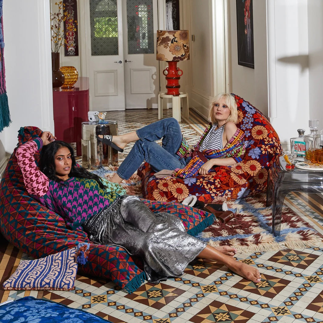 “Our signature bean bag gets a retro-inspired update in this geometric print. Created to look like a vintage velvet sofa at Nonna’s house that you just want to snuggle into. Textural fringe trim adds an extra touch of fun to this relaxation-ready essential.” – Phoebe’s Style Notes