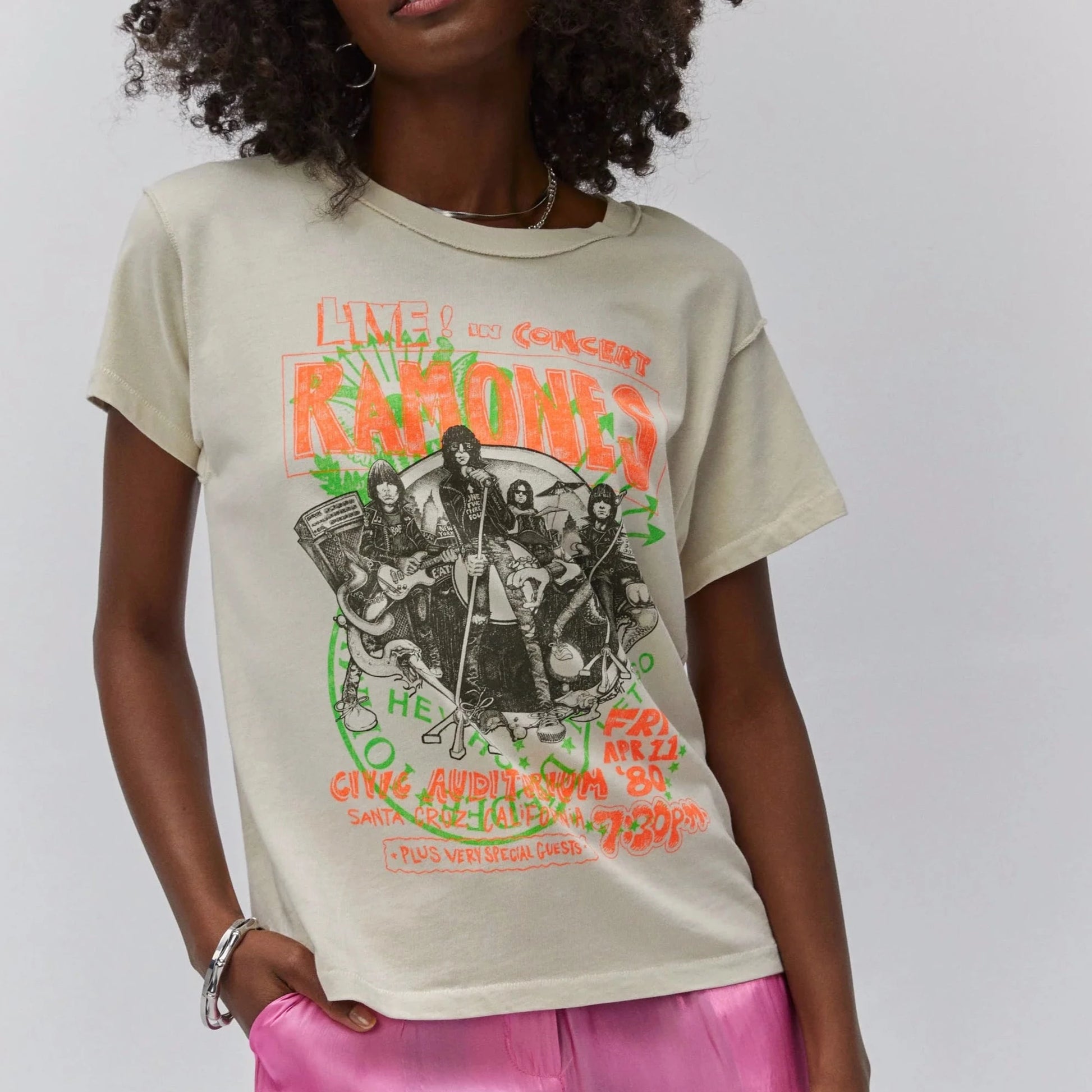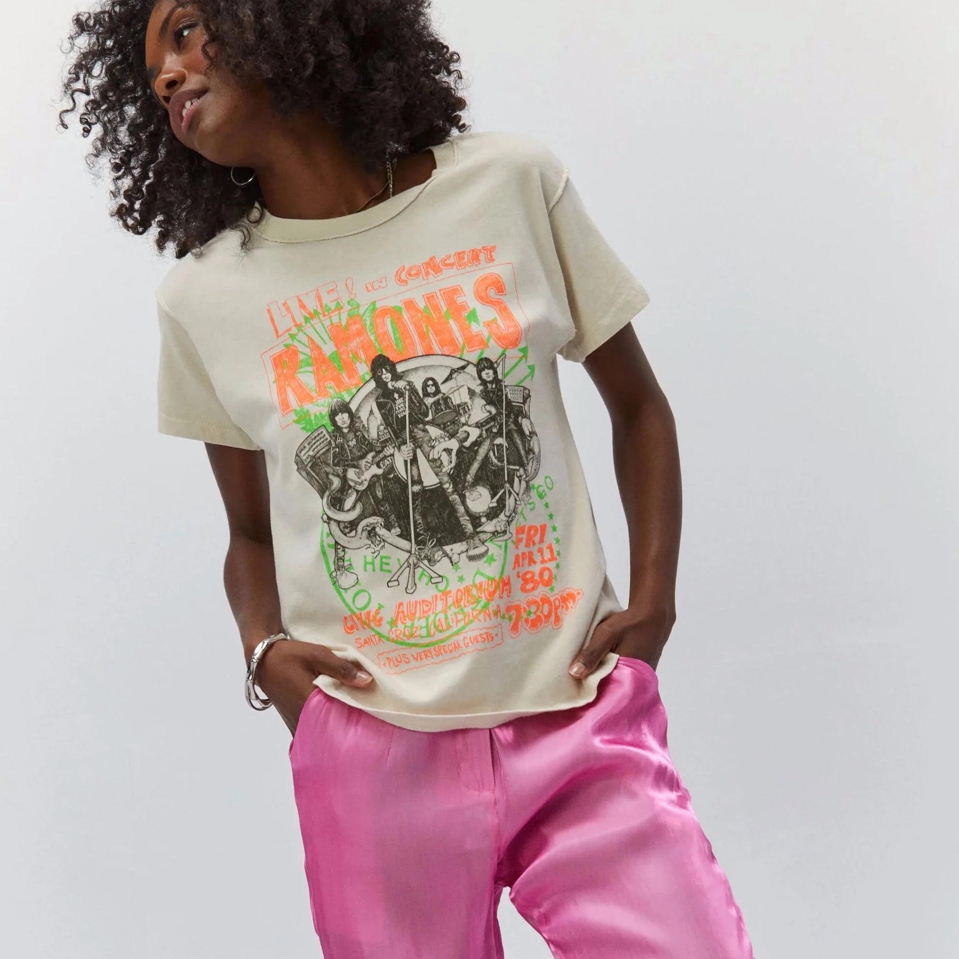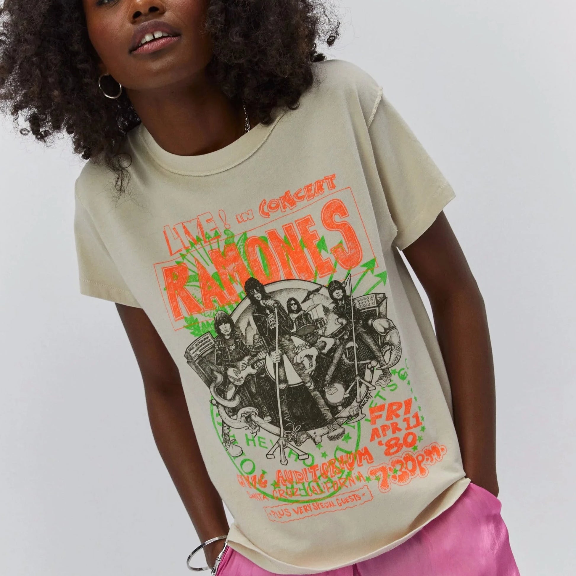 Rock your rotation with the newest Ramones tee to drop. Meant to capture the raw energy and rebellion of the Ramones, this reverse girlfriend tee shouts out their concert at Santa Monica’s Civic Auditorium on April 11, 1980 as part of the band’s Road to Ruin Tour.