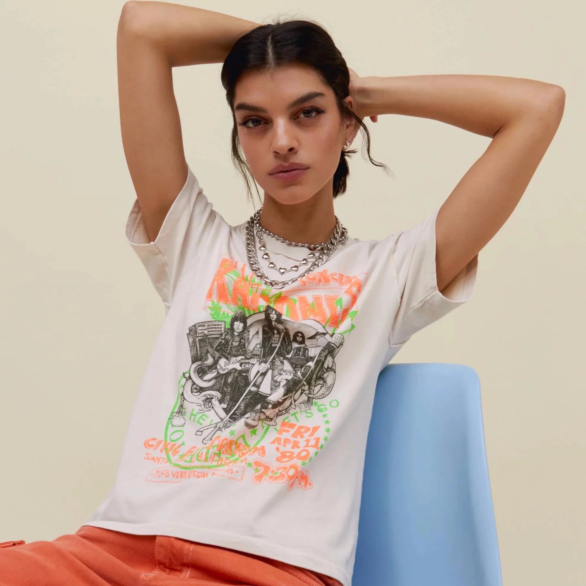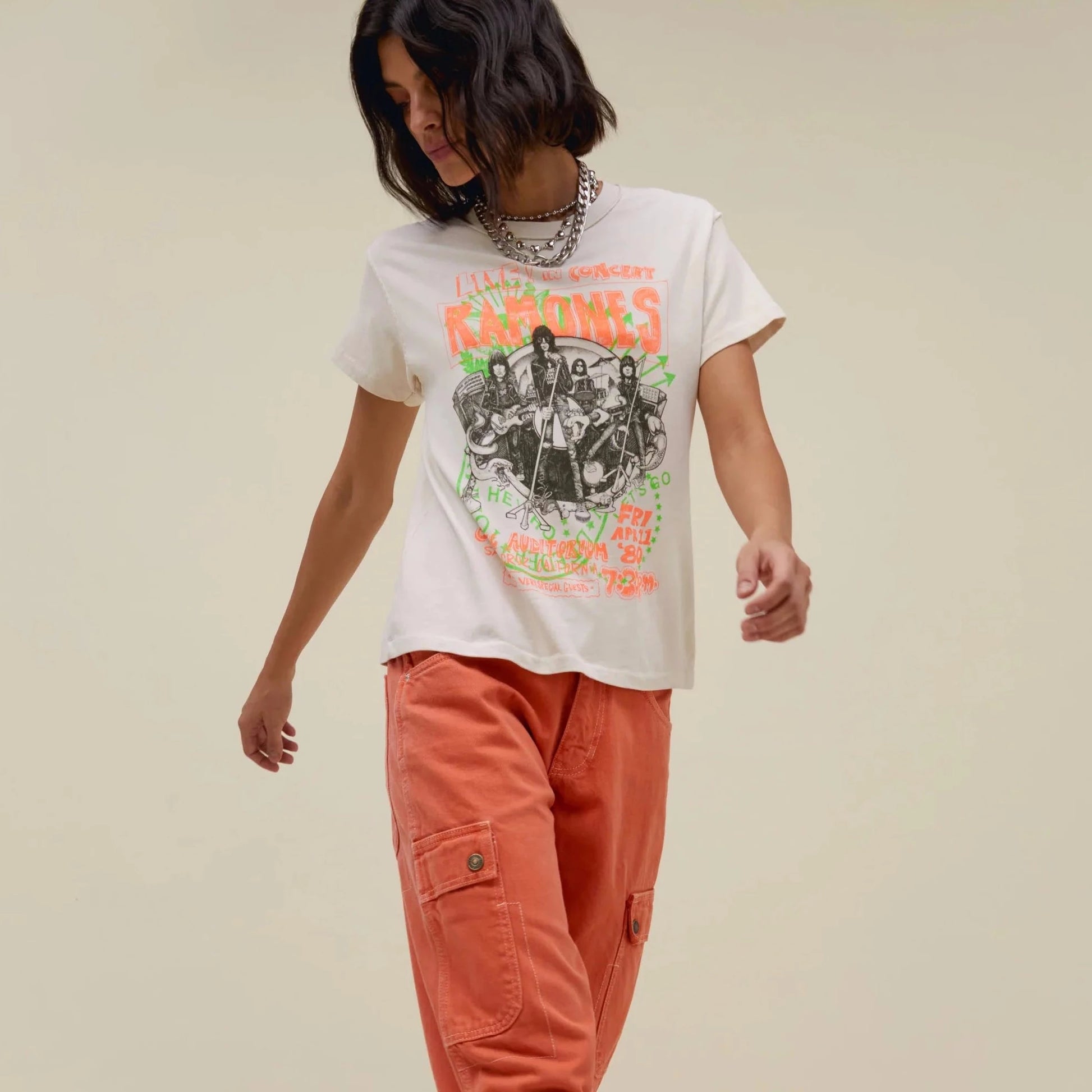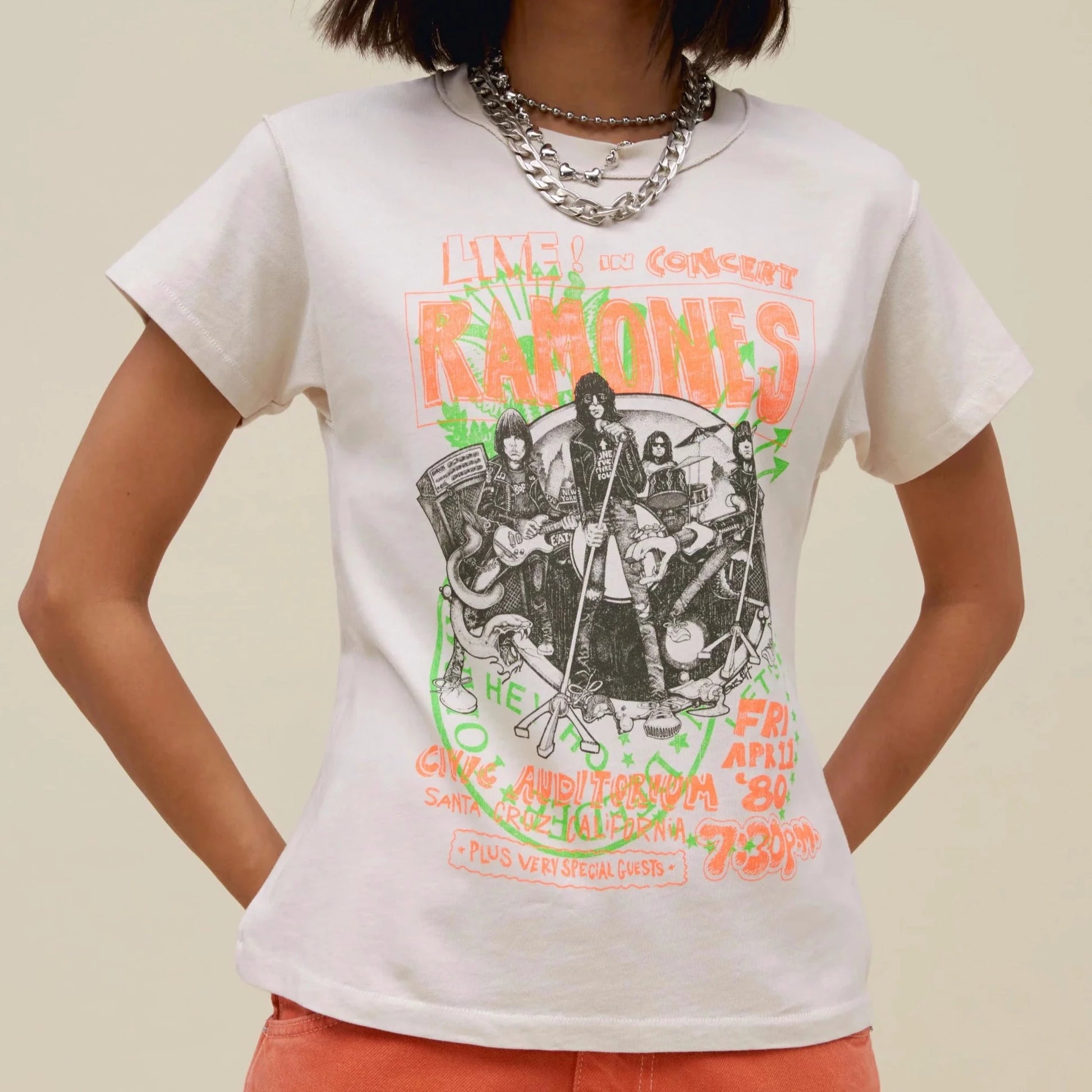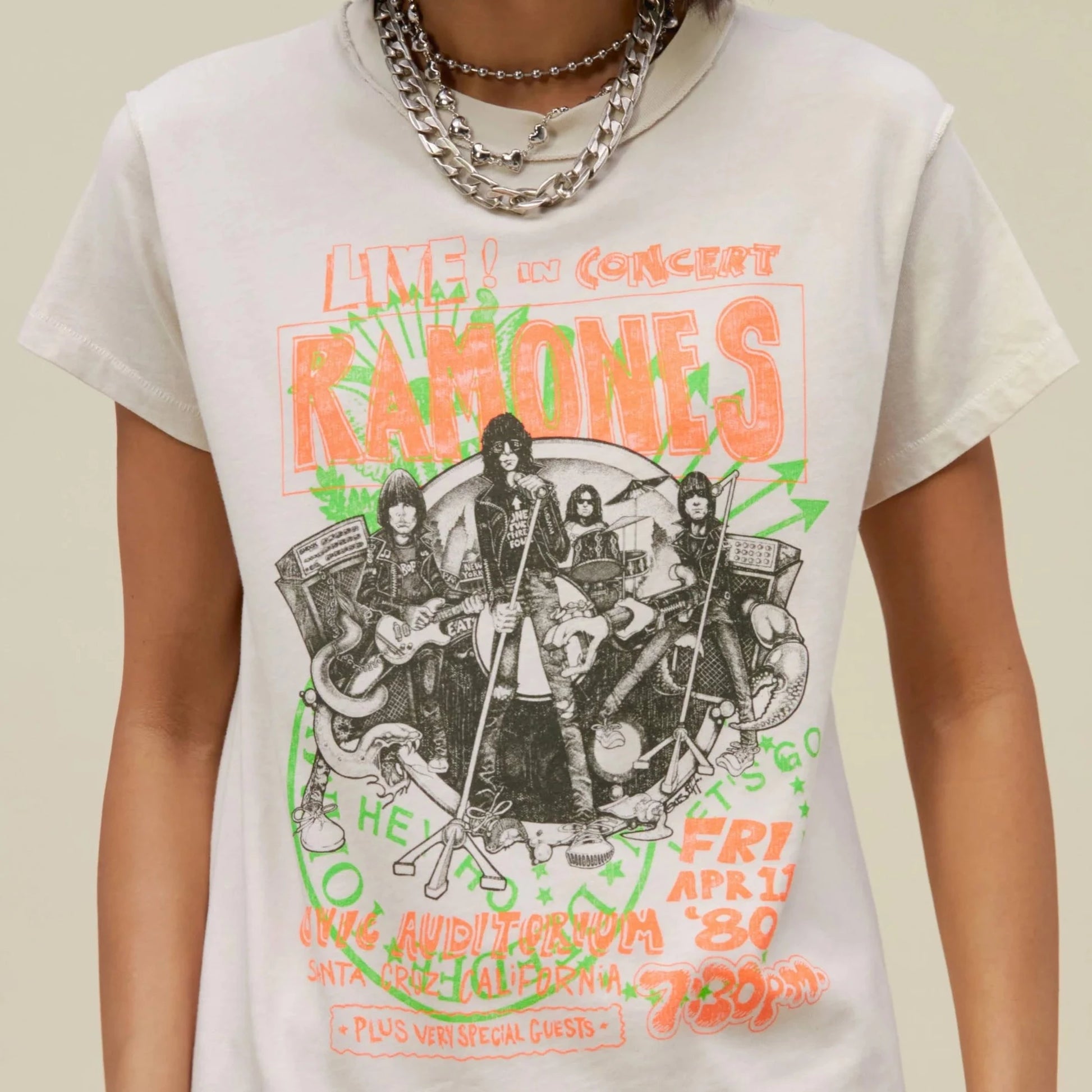 Rock your rotation with the newest Ramones tee to drop. Meant to capture the raw energy and rebellion of the Ramones, this reverse girlfriend tee shouts out their concert at Santa Monica’s Civic Auditorium on April 11, 1980 as part of the band’s Road to Ruin Tour.