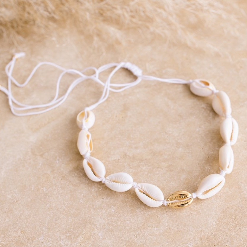 A gorgeous cowrie shell choker featuring a striking gold plated shell.