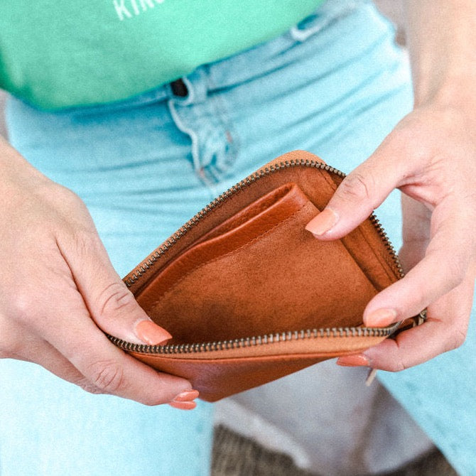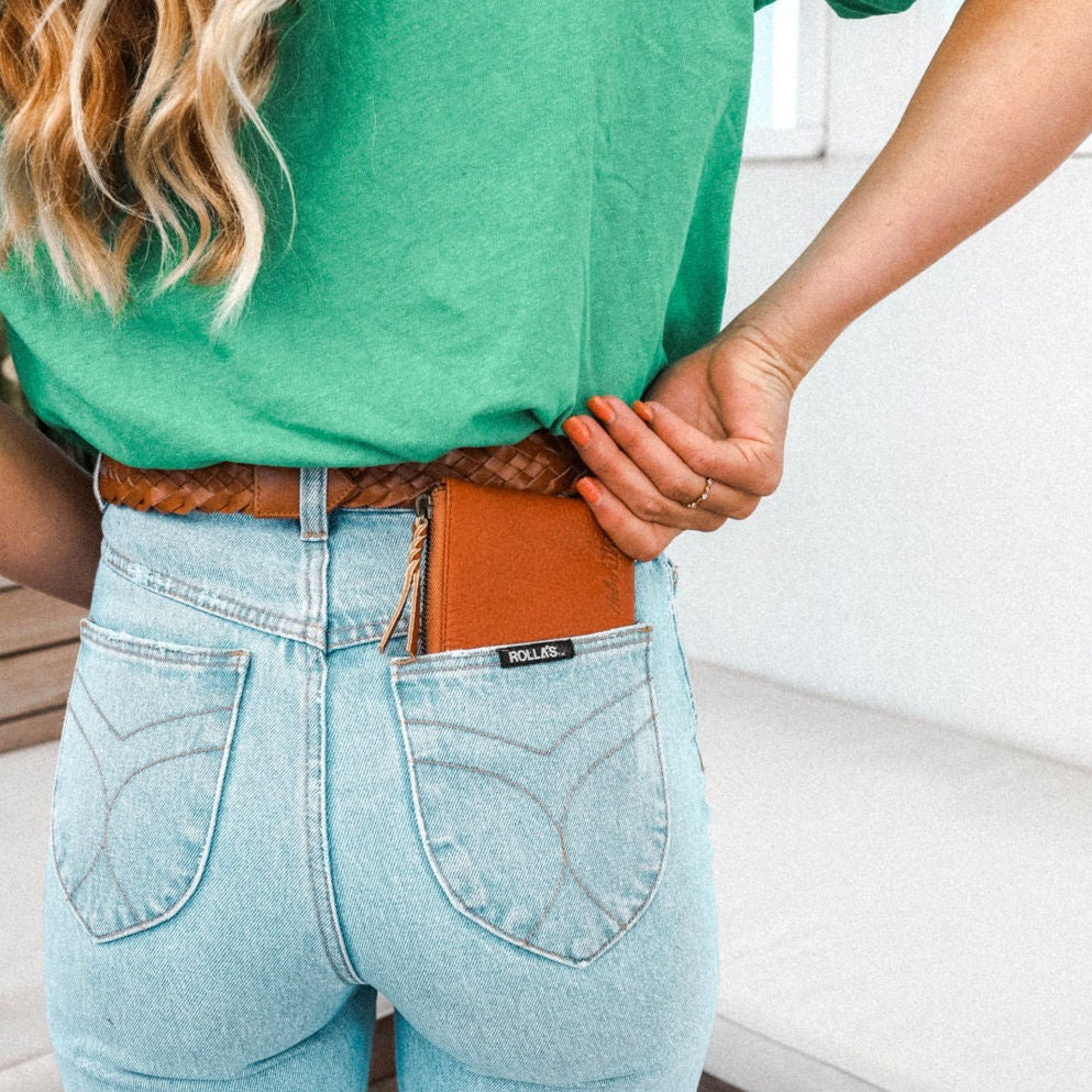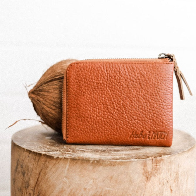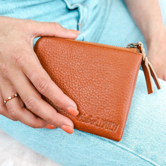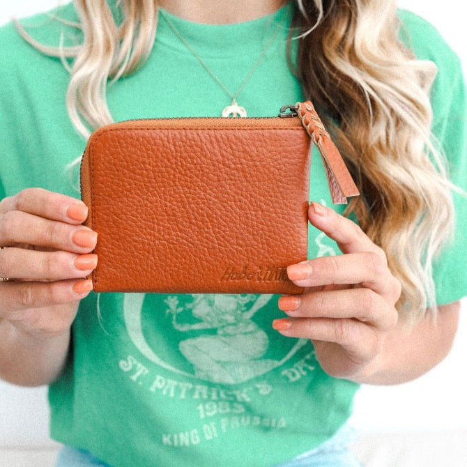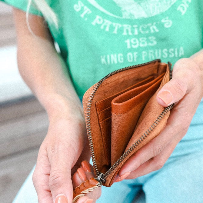 Featuring a braided leather zip. She opens to 3 card slots and an inner pocket.