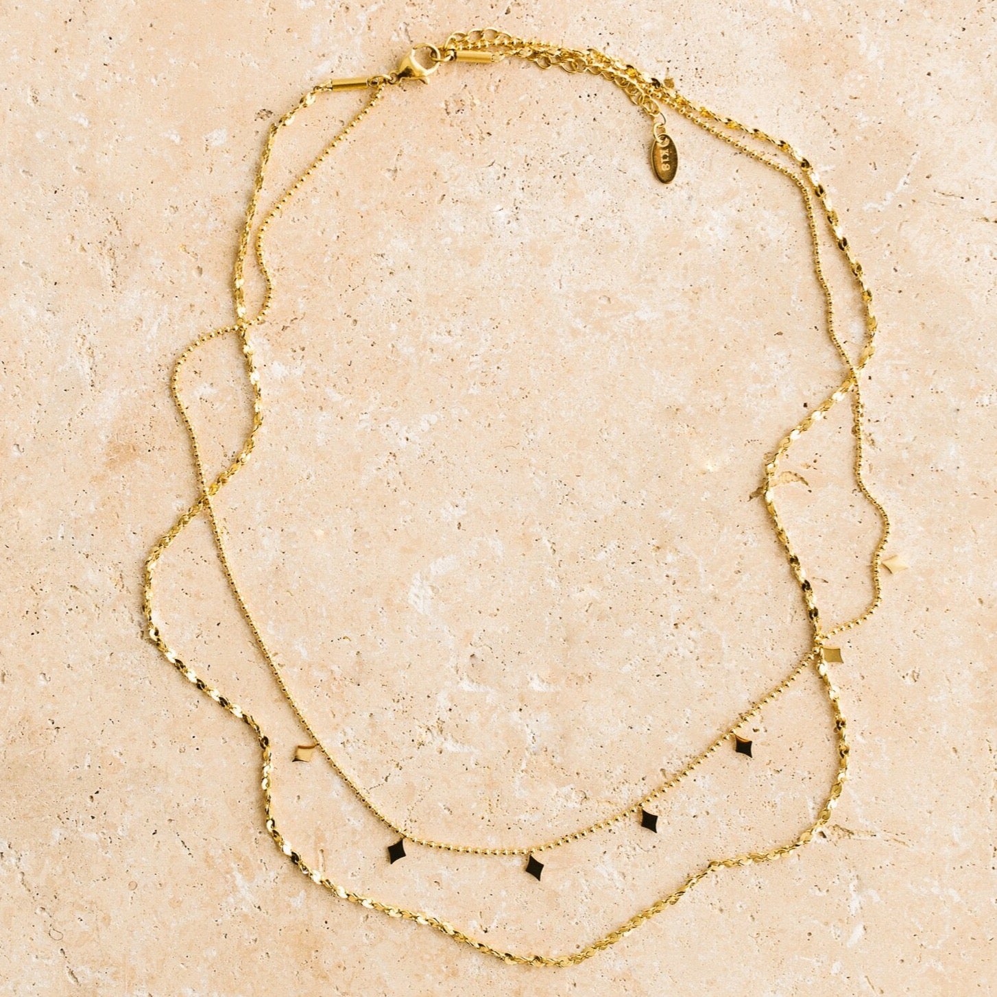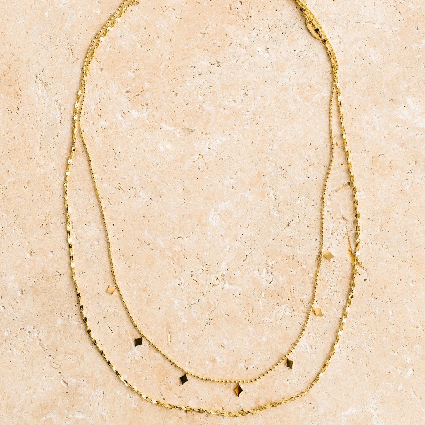 A gorgeous double layered necklace featuring diamond pendants. Perfect for the bohemian goddess.