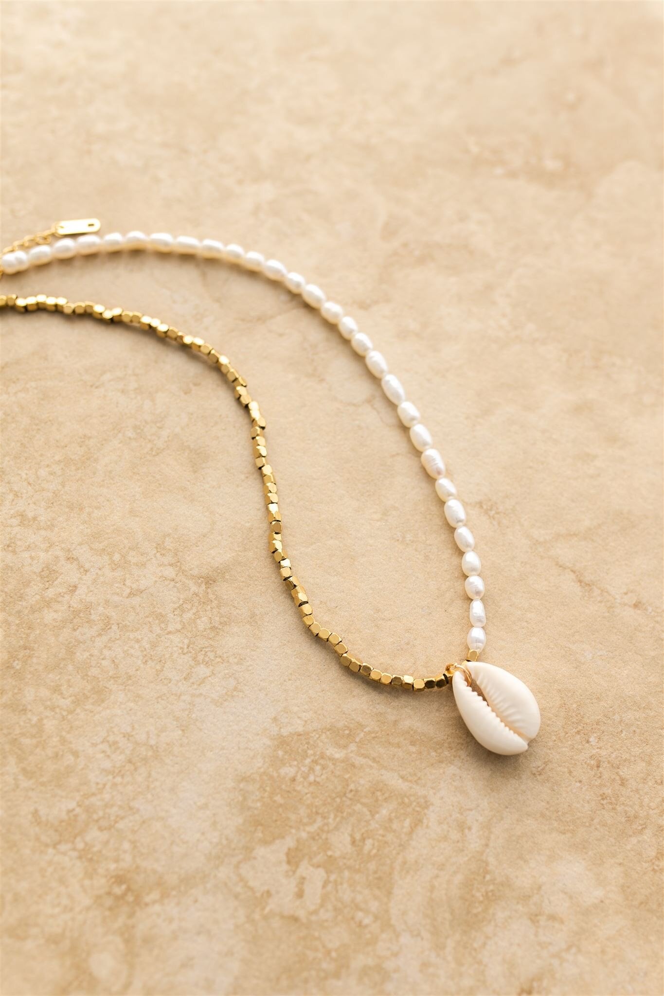A natural cowrie shell embraced by gold hues and fresh water pearls.